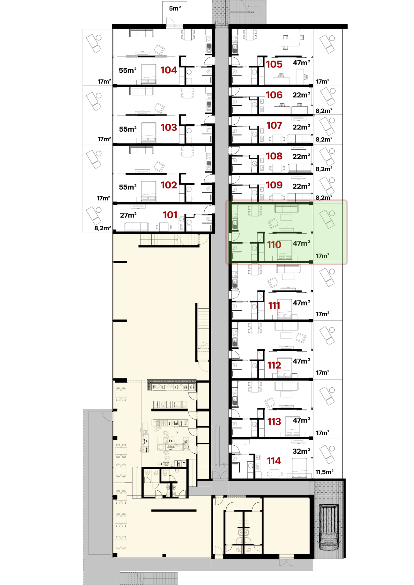 Byt 110 sa nachádza na prízemí a je orientovaný na západ, smerom k lesu, čo vytvára pokojné súkromie a príjemné večerné svetlo.