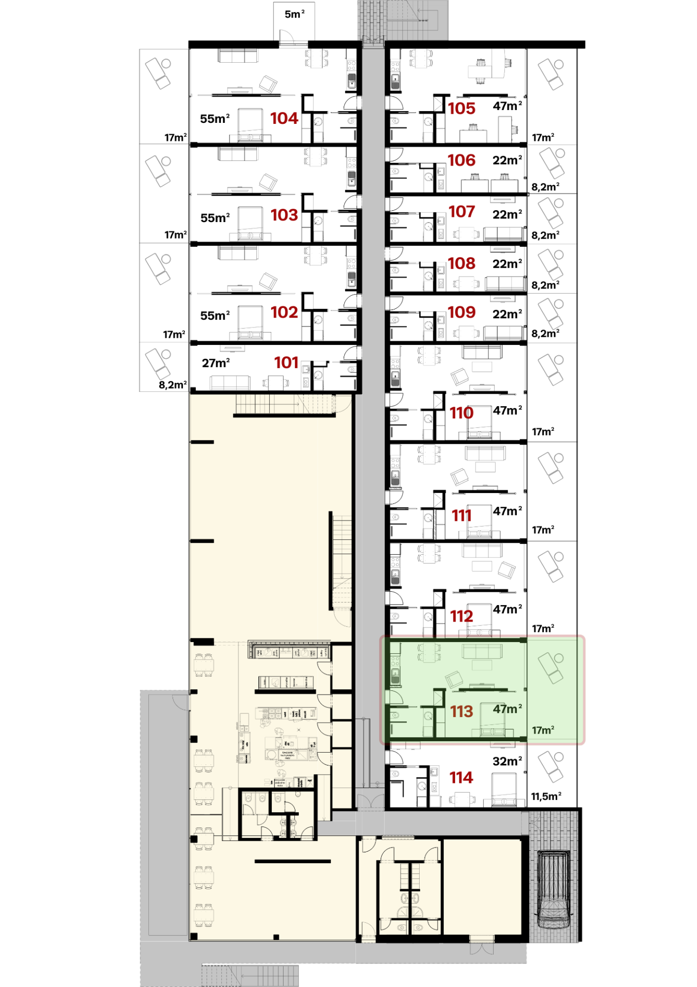 Byt 113 sa nachádza na prízemí a je orientovaný na západ, smerom k lesu, čo prináša príjemné súkromie a pokojné výhľady.