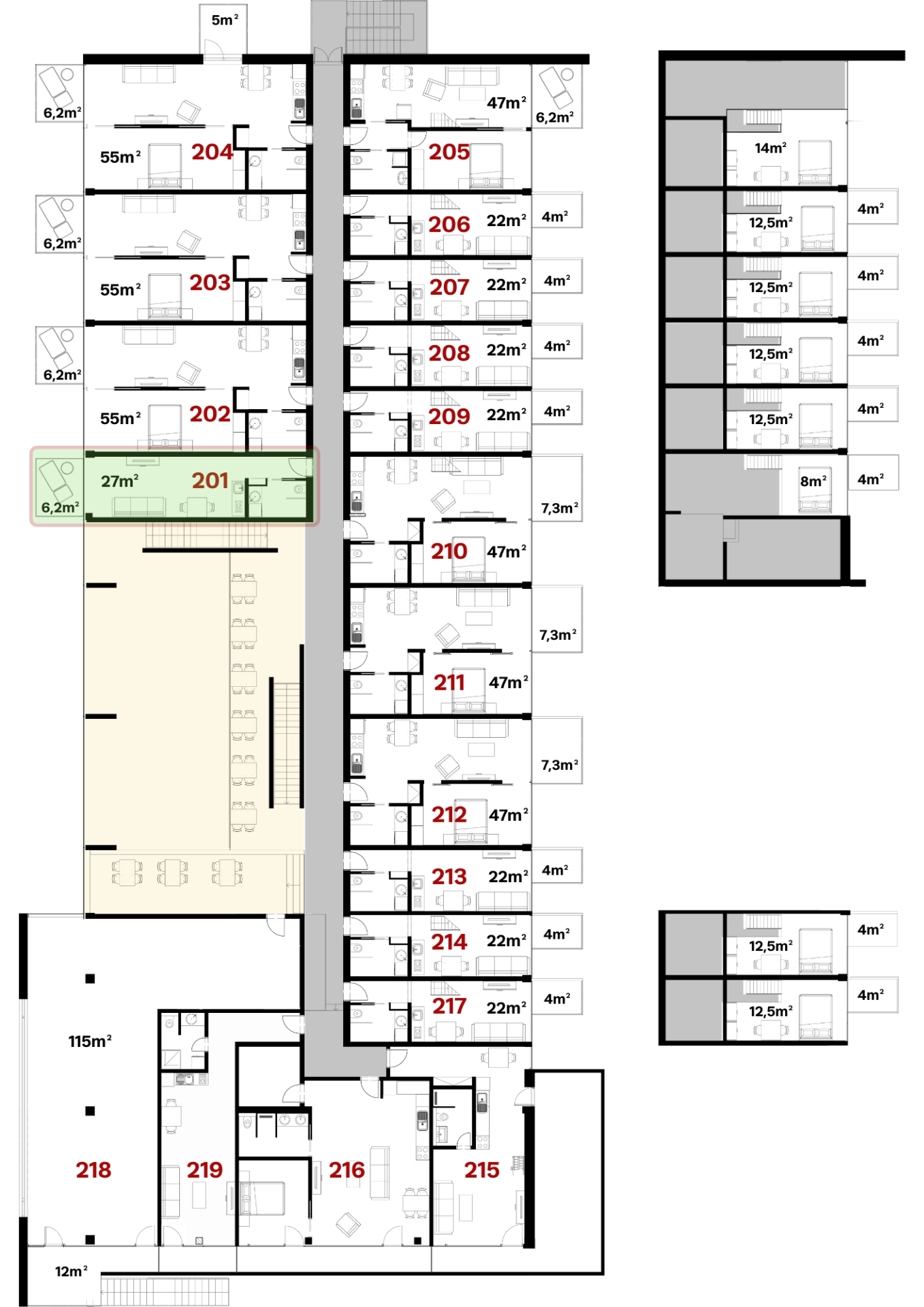 Byt 201 sa nachádza na druhom podlaží a je orientovaný na východ, smerom ku golfovému ihrisku, čo prináša príjemné ranné svetlo a otvorené výhľady.