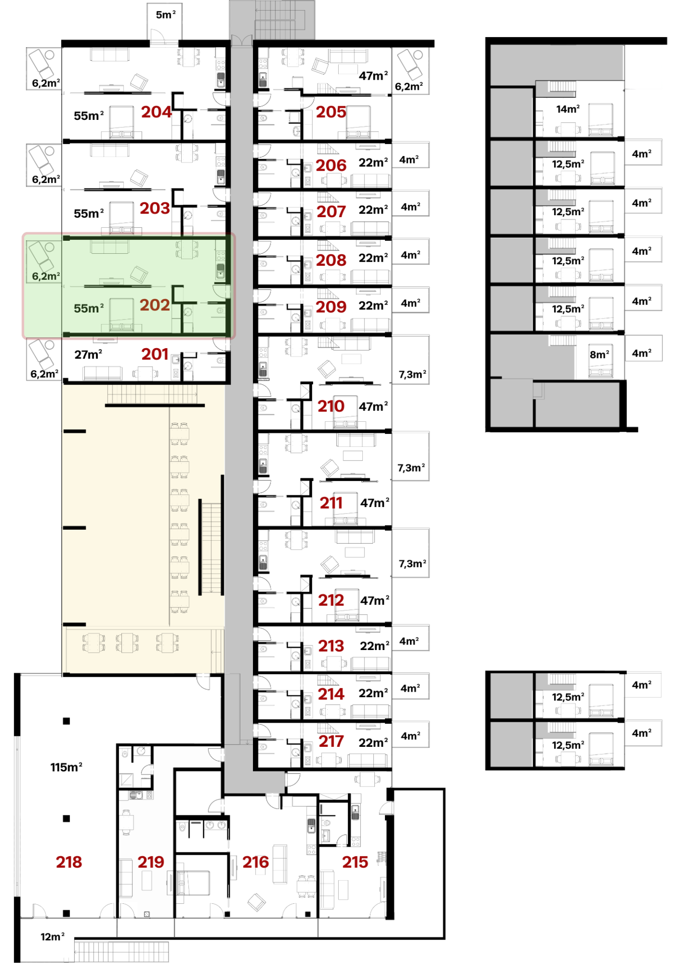 Byt 202 sa nachádza na druhom podlaží a je orientovaný na východ, smerom ku golfovému ihrisku, čo zabezpečuje príjemné ranné svetlo a otvorené výhľady.