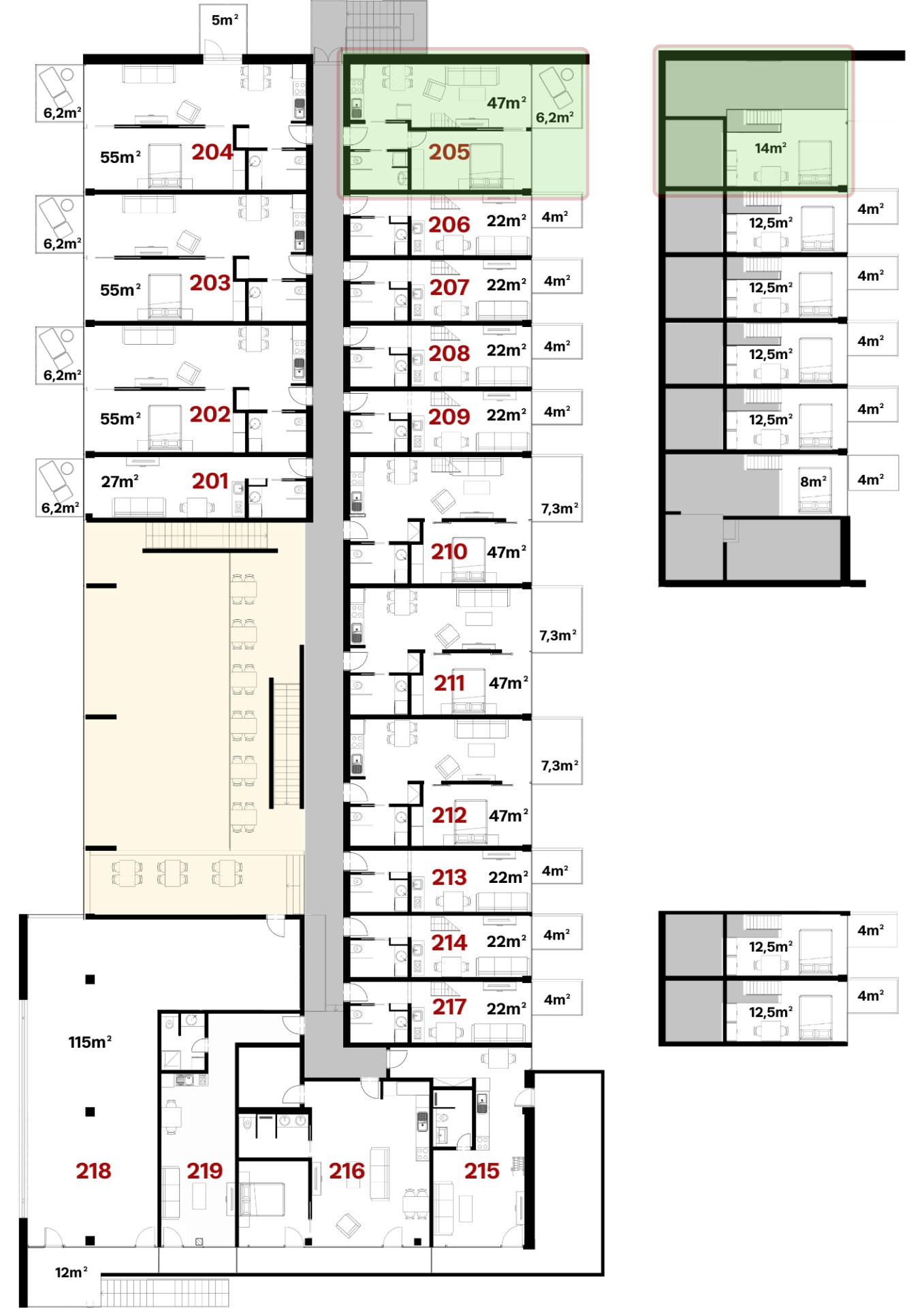 Byt 205 sa nachádza na druhom podlaží a je orientovaný na západ, smerom do lesa, čo prináša pokojné výhľady a príjemné večerné svetlo.