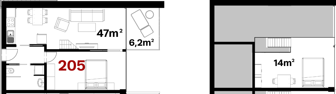 Spodné podlažie má výmeru 47 m² a dopĺňa ho balkón o veľkosti 6,2 m². Otvorené medziposchodie ponúka ďalších 14 m², ktoré rozširujú obytný priestor a vytvárajú zaujímavý architektonický prvok vhodný na spálňu, pracovňu alebo oddychovú zónu.