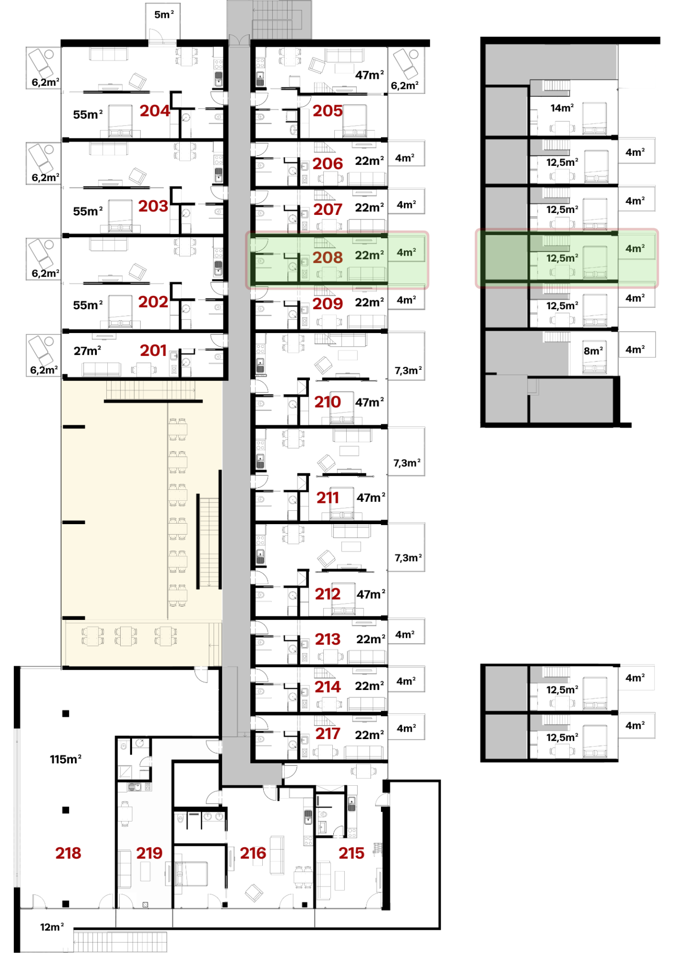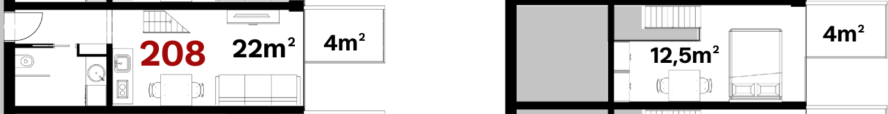 Spodné podlažie má výmeru 22 m² a disponuje balkónom o veľkosti 4 m². Otvorené medziposchodie ponúka 12,5 m² a vlastný balkón s výmerou 4 m², čím sa obytný priestor prirodzene rozširuje a ponúka viac možností využitia.