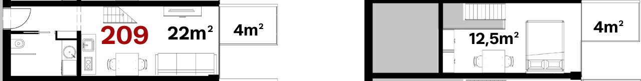 Spodné podlažie má výmeru 22 m² a disponuje balkónom o veľkosti 4 m². Otvorené medziposchodie ponúka 12,5 m² a vlastný balkón s výmerou 4 m², čím sa obytný priestor prirodzene rozširuje a ponúka viac možností využitia.