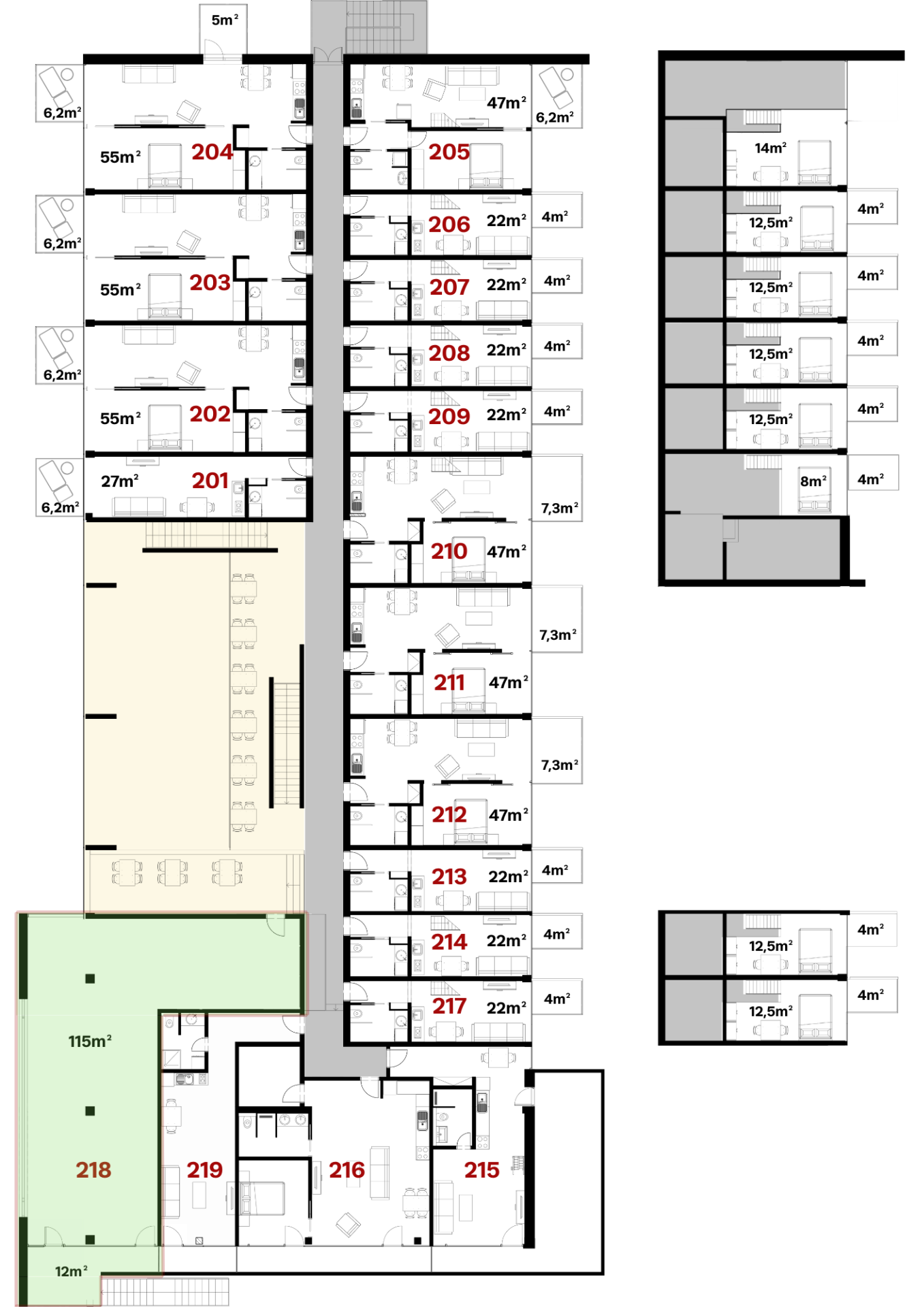 Byt 218 sa nachádza na druhom podlaží a je orientovaný na severovýchod – na sever ponúka výhľad na Vysoké Tatry a na východ smeruje ku golfovému ihrisku. Táto orientácia zabezpečuje dostatok prirodzeného svetla a atraktívne panoramatické výhľady.