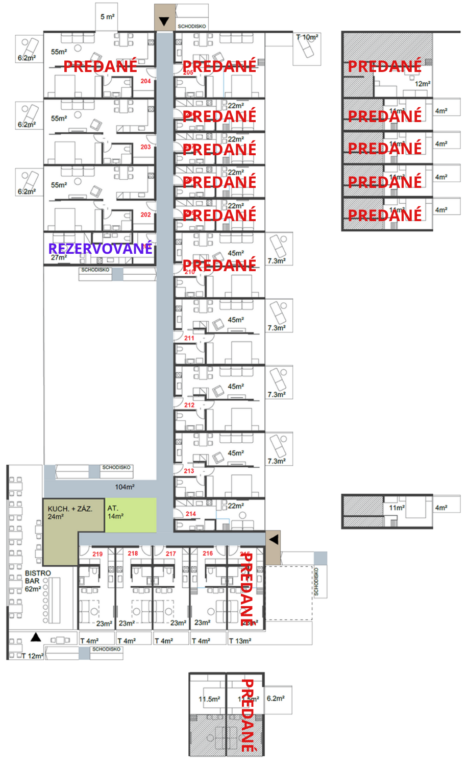 | Číslo bytu | Plocha bytu | Mezanín | Balkón / terasa | Obsadenosť |