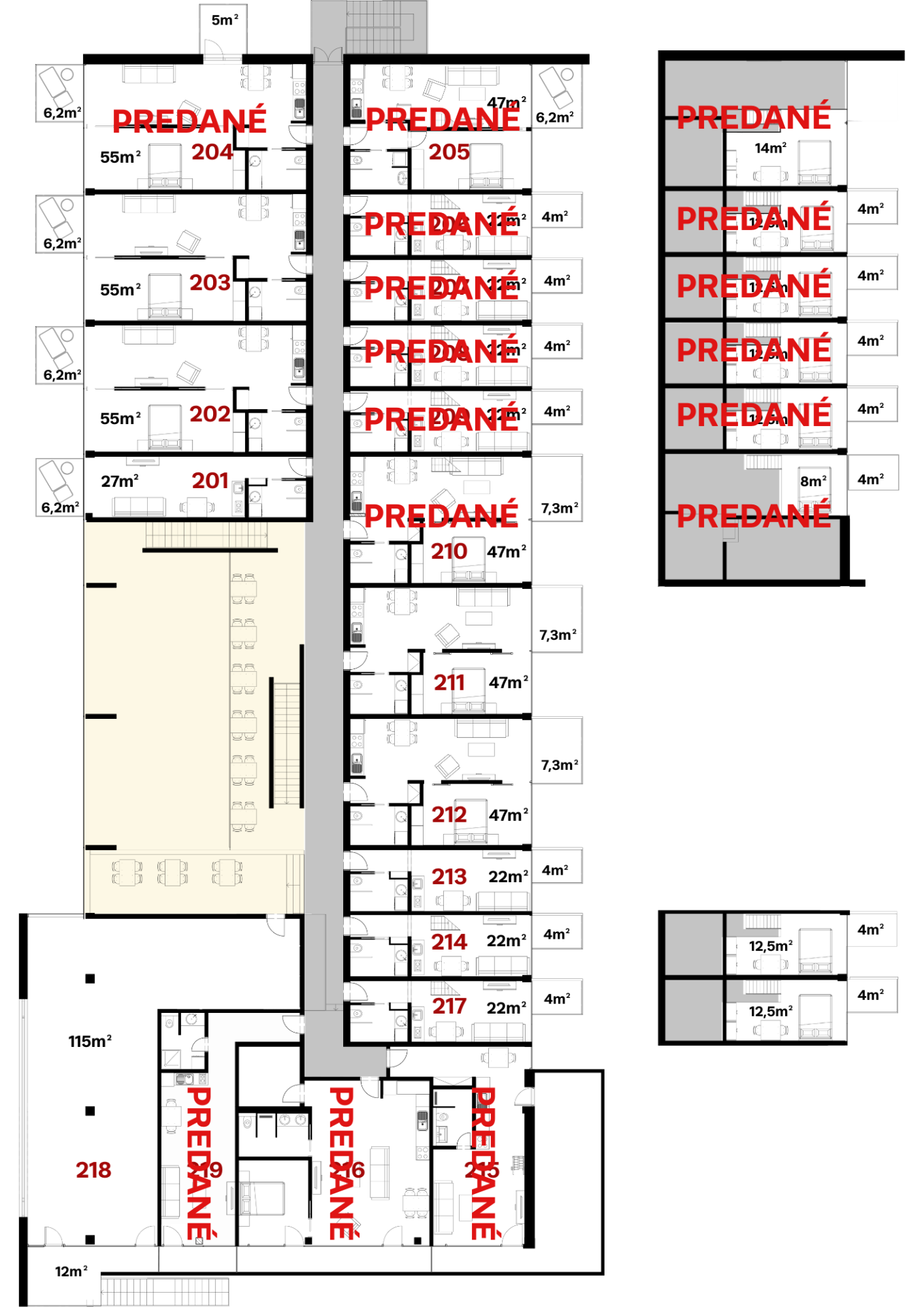 | Číslo bytu | Plocha | Mezanín | Balkón / terasa | Obsadenosť |