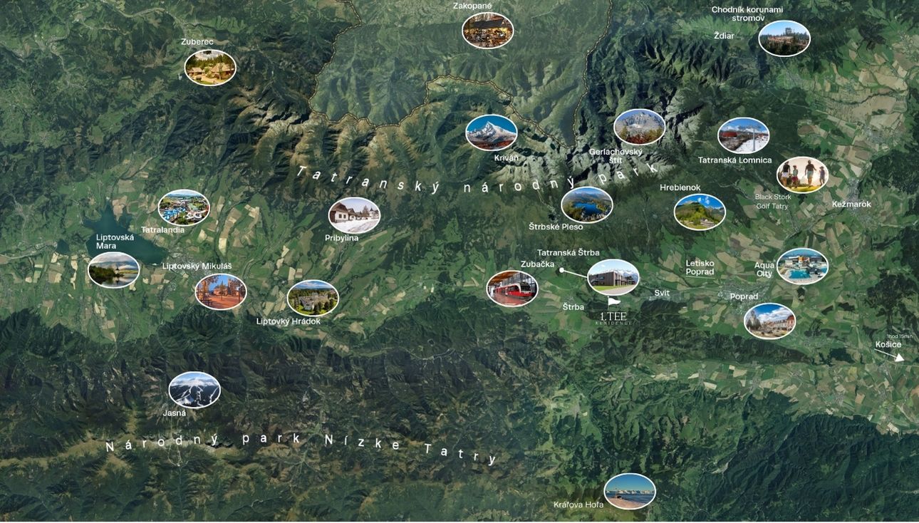 Všetky rýchliky stoja priamo v Tatranskej Štrbe, diaľnica D1 je na dosah dvoch minút a Popradské letisko obslúži spojenia do celej Európy. A keď sa vrátite z ciest, čaká na vás pokoj horskej obce, vôňa čerstvého jedla z prízemia a nekonečné možnosti športu či relaxu v okruhu tridsiatich minút. First Tee tak nie je len adresou – je to životný štýl, ktorý spája prírodu, šport a moderný mestský komfort v jednej nadčasovej stavbe.