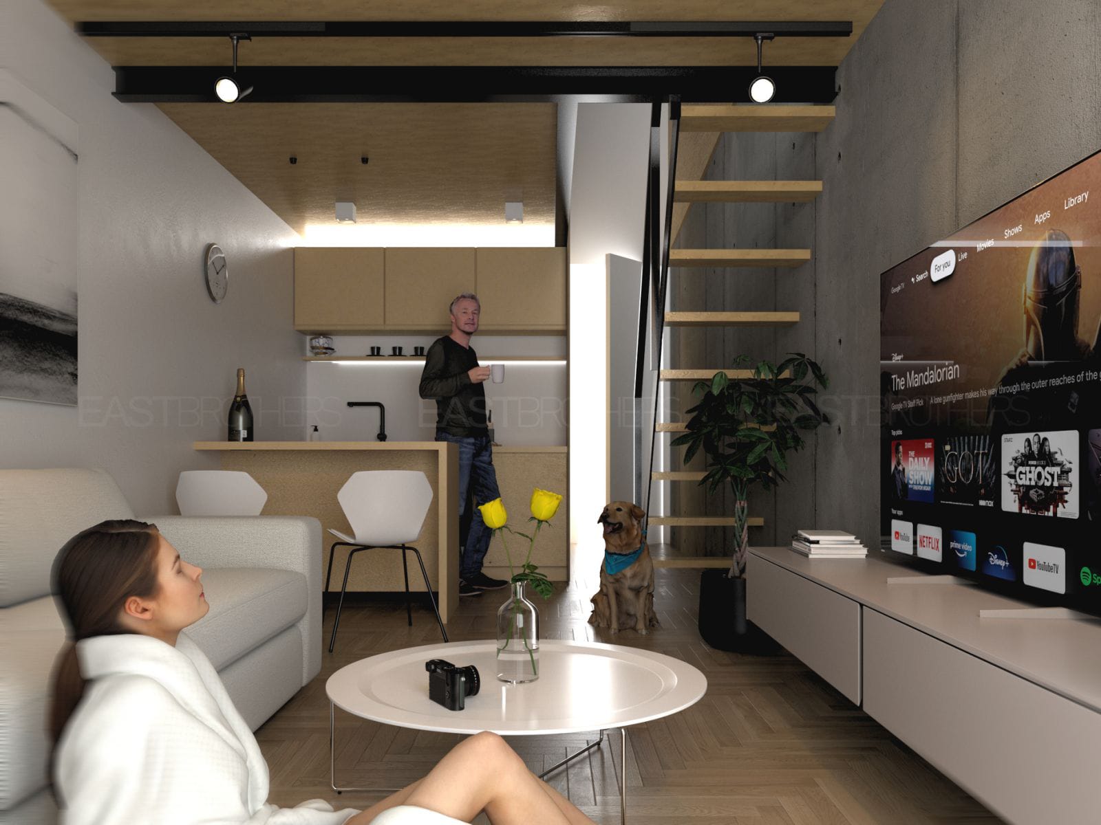 V interiéri dominujú prírodné materiály, ktoré prinášajú do domova teplo aj nadčasový dizajn. Dubové podlahy s kartáčovanou textúrou prechádzajú celým obytným priestorom – sú odolné, príjemné na dotyk a krásne starnú. V kuchyniach však architekti zvolili liaty pohľadový betón s jemne vybrúseným povrchom. Tento betónový koberec tvorí subtílny predel medzi kulinárskou a obývacou zónou a súčasne odoláva vyššiemu zaťaženiu, vlhkosti či občasným nehodám pri varení, ktoré by drevenú podlahu poškodili.