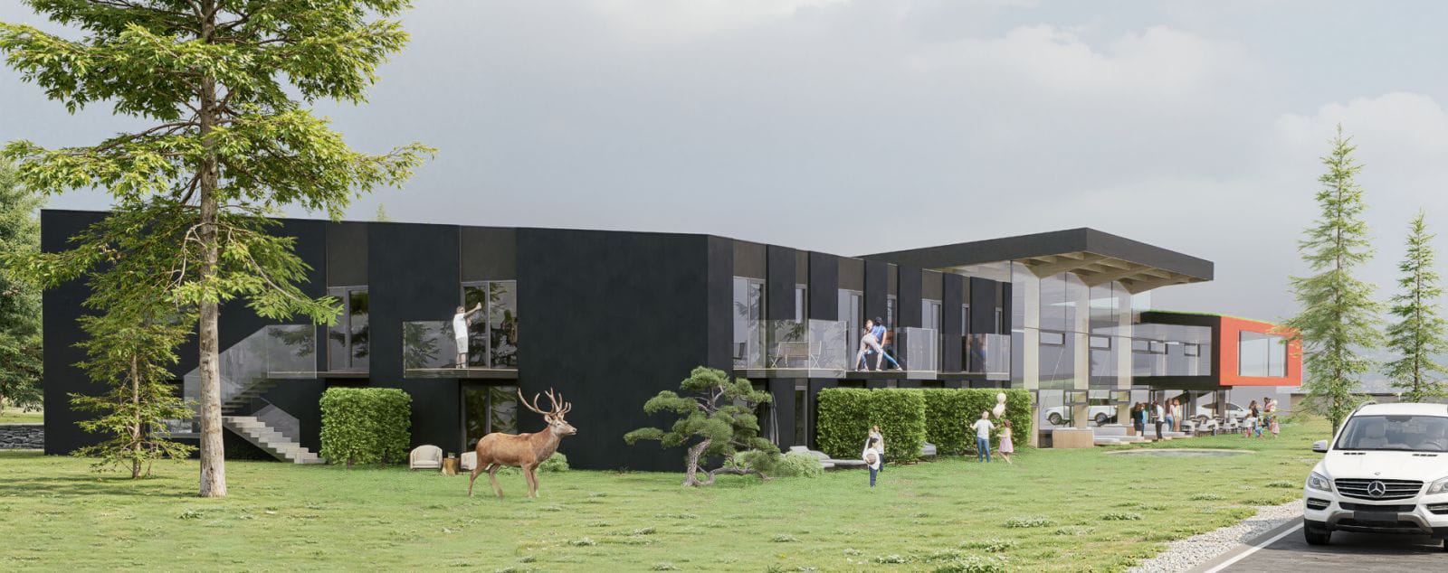First Tee spája horské ticho s mestským komfortom v dvoch nadzemných podlažiach so 36 bytmi. Parter patrí nebytovému priestoru ktorý môže byť kaviareň, pekáreň či reštaurácia alebo aj požičovňa bicyklov. Dispozície sme navrhli tak, aby vyhovovali mladým párom alebo menejčlenným rodinám; loftové mezonety s medziposchodím ponúkajú intímnu spálňu s výhľadom do prírody, menšie apartmány zase ideálnu investíciu na krátkodobý prenájom. K praktickému životu prispieva 47 parkovacích miest pre osobné autá, štyri pre dodávky, nabíjacie stanice pre elektromobily a elektrobicykle.